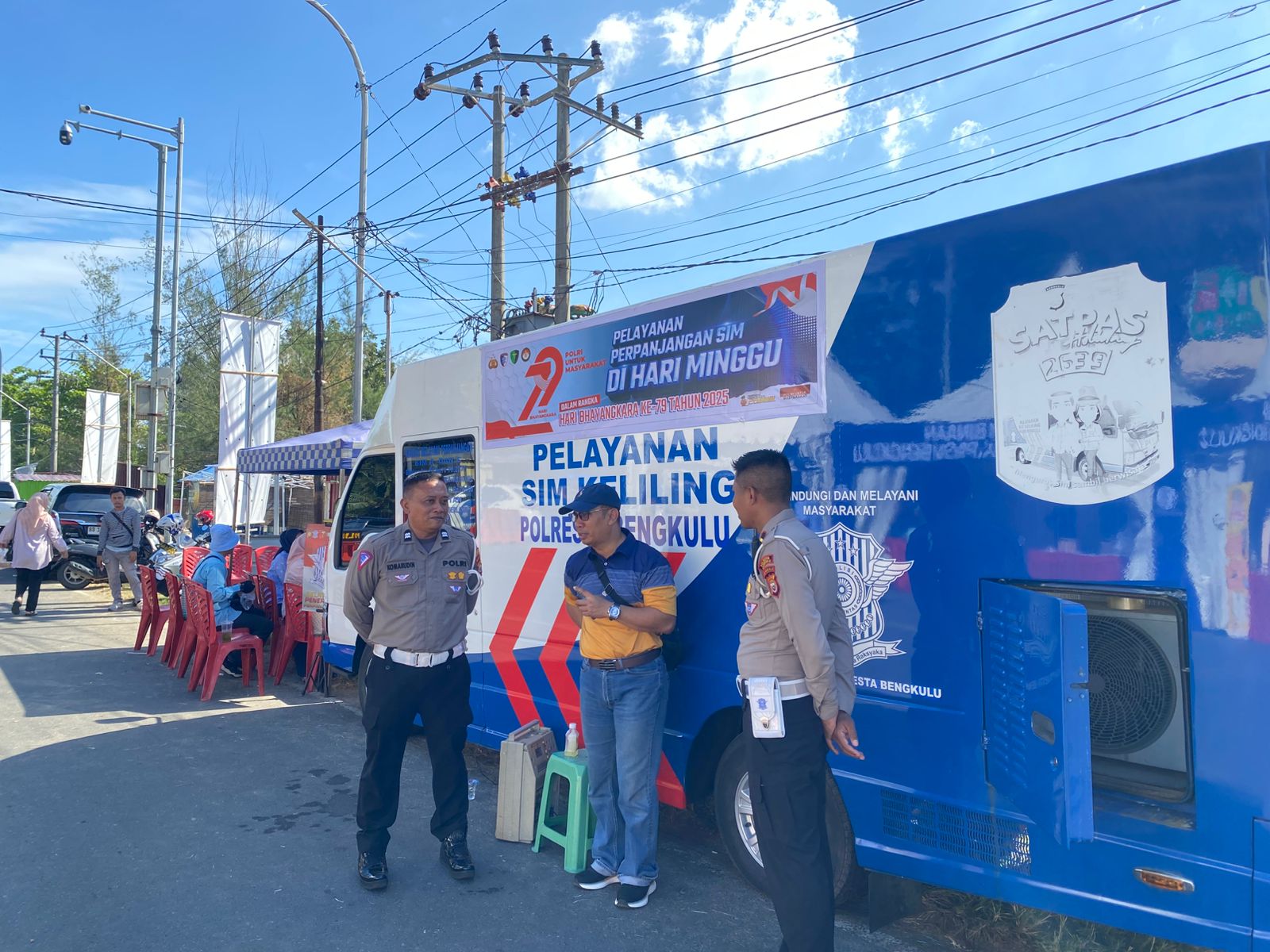 Bengkulu - Dalam rangka memperingati Hari Ulang Tahun (HUT) Bhayangkara, Ditlantas Polda Bengkulu mengadakan pelayanan SIM keliling dan Samsat keliling di acara Car Free Day (CFD). Kegiatan ini bertujuan untuk memberikan kemudahan kepada masyarakat dalam mengurus perpanjangan SIM dan membayar pajak kendaraan.