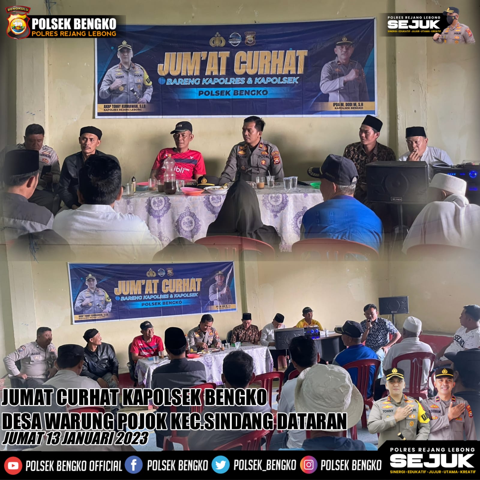 Rejang Lebong, Viralpublik.com - Kapolres Rejang Lebong Polda Bengkulu bersama Kapolsek Bengko IPTU M.Dodi Mardiansyah,SH, kembali menampung keluhan masyarakat Wilkum Polsek Bengko terhadap kepolisian di kegiatan Jumat Curhat, di Balai Desa Warung Pojok Kecamatan Sindang Dataran,Jumat,(13/01/2023).